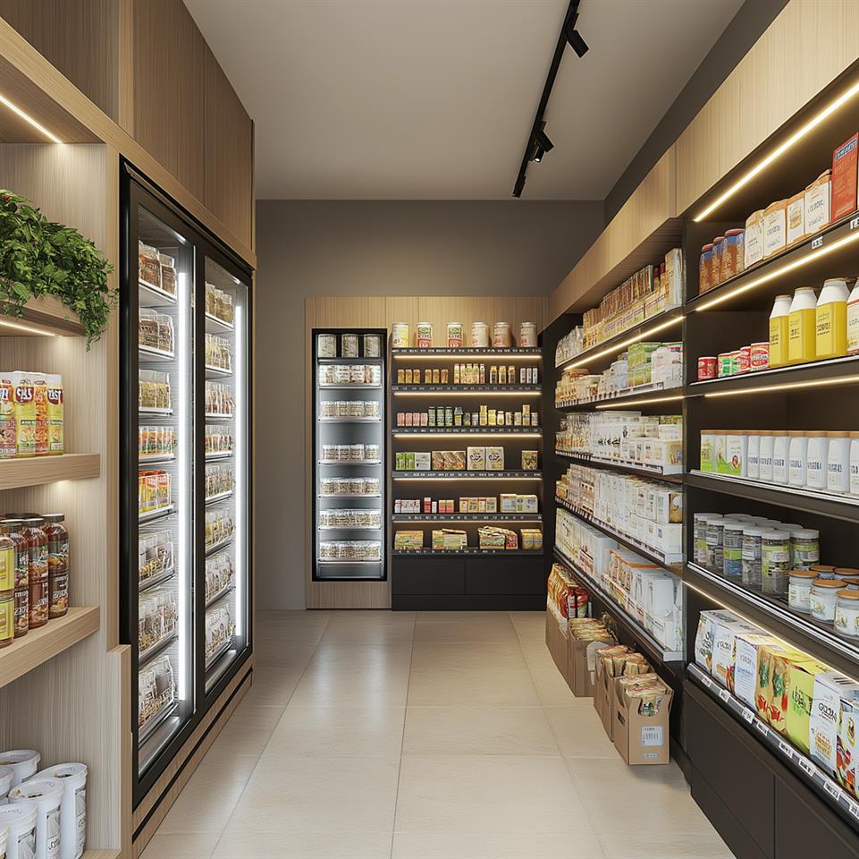 Lojas com pé-direito duplo voltadas para a rua.